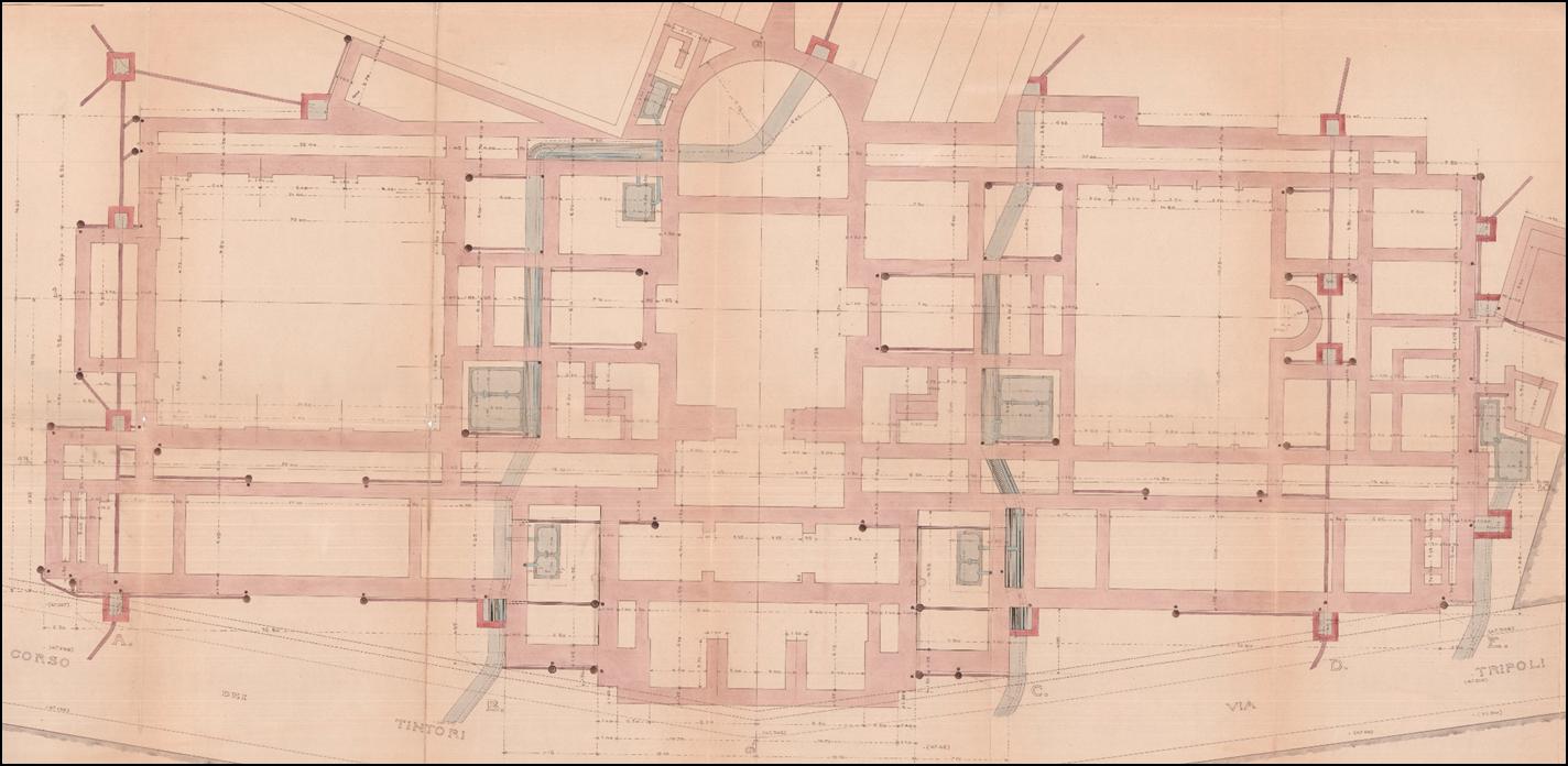 - Rilievo: la mancanza di tavole tecniche aggiornate riportanti la posizione e le caratteristiche geometriche della rete di drenaggio hanno reso necessarie una serie di attività volte all’ottenimento di tali informazioni. Inizialmente, parte delle tavole progettuali elaborate dall’ing. Bazzani sono state ritrovate negli archivi storici della città. In seguito, una dettagliata campagna di rilievi in situ ha permesso di mappare tutti gli elementi della rete, valutarne le caratteristiche geometriche e l’integrità. Sono state adottate anche sofisticate tecniche geofisiche (georadar) per la scansione degli strati sub-superficiali e la ricerca di eventuali strutture relitte.